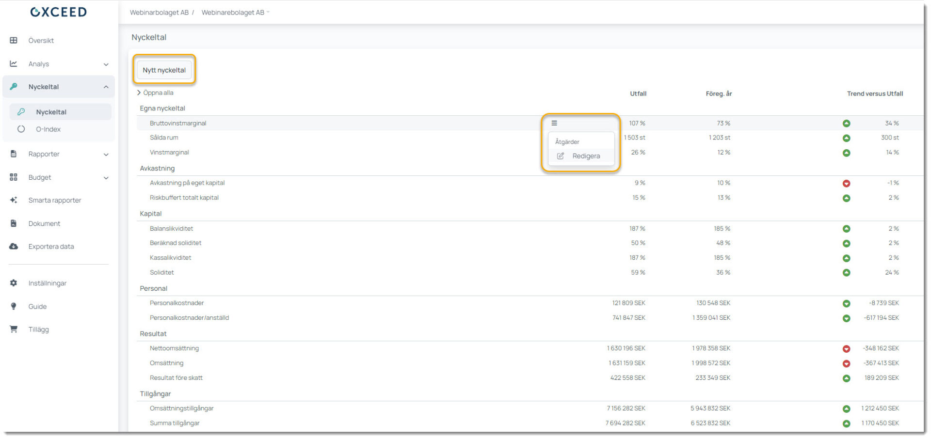 Önskar du redigera ett befintligt eget nyckeltal, för du muspekaren över nyckeltalet, klickar på hamburgermenyn (tre streck) som dyker upp och väljer sedan ”Redigera”.