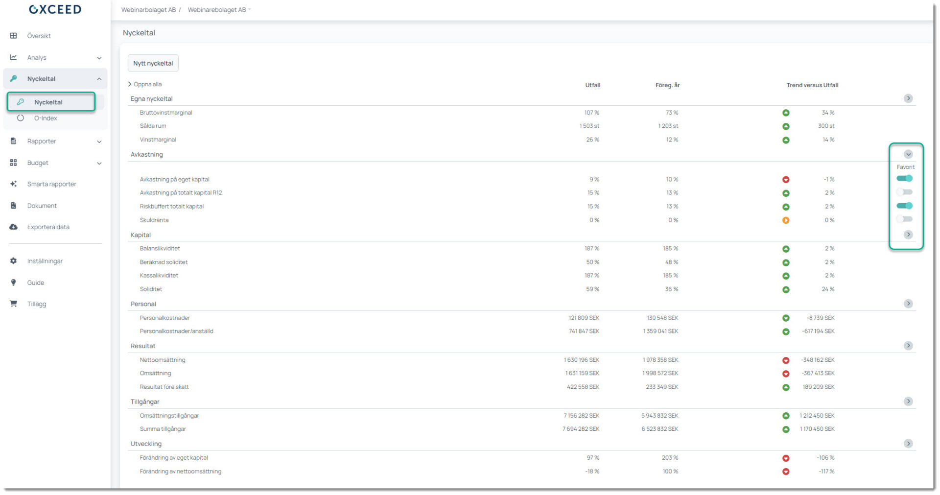 Oxceeds nyckeltalsbibliotek innehåller cirka 120 fördefinierade nyckeltal som är tillgängliga för alla användare. Dessa nyckeltal är noggrant kategoriserade för att underlätta översikten och analysen inom olika affärsområden.