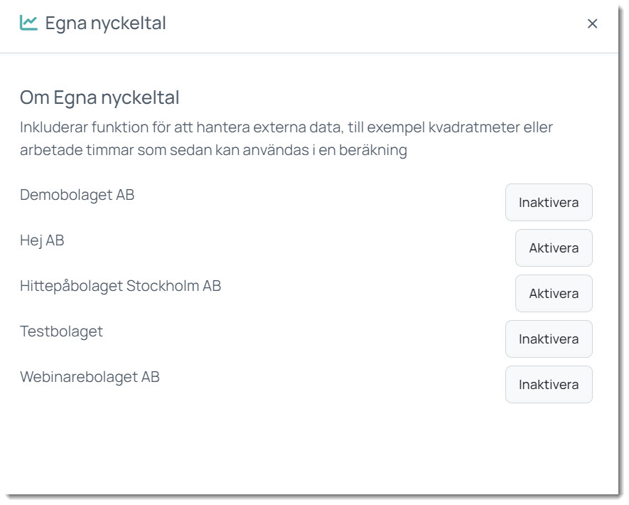 - Aktivera/Inaktivera: Styr vilka tillägg som är aktiva för respektive företag inom din prenumeration.