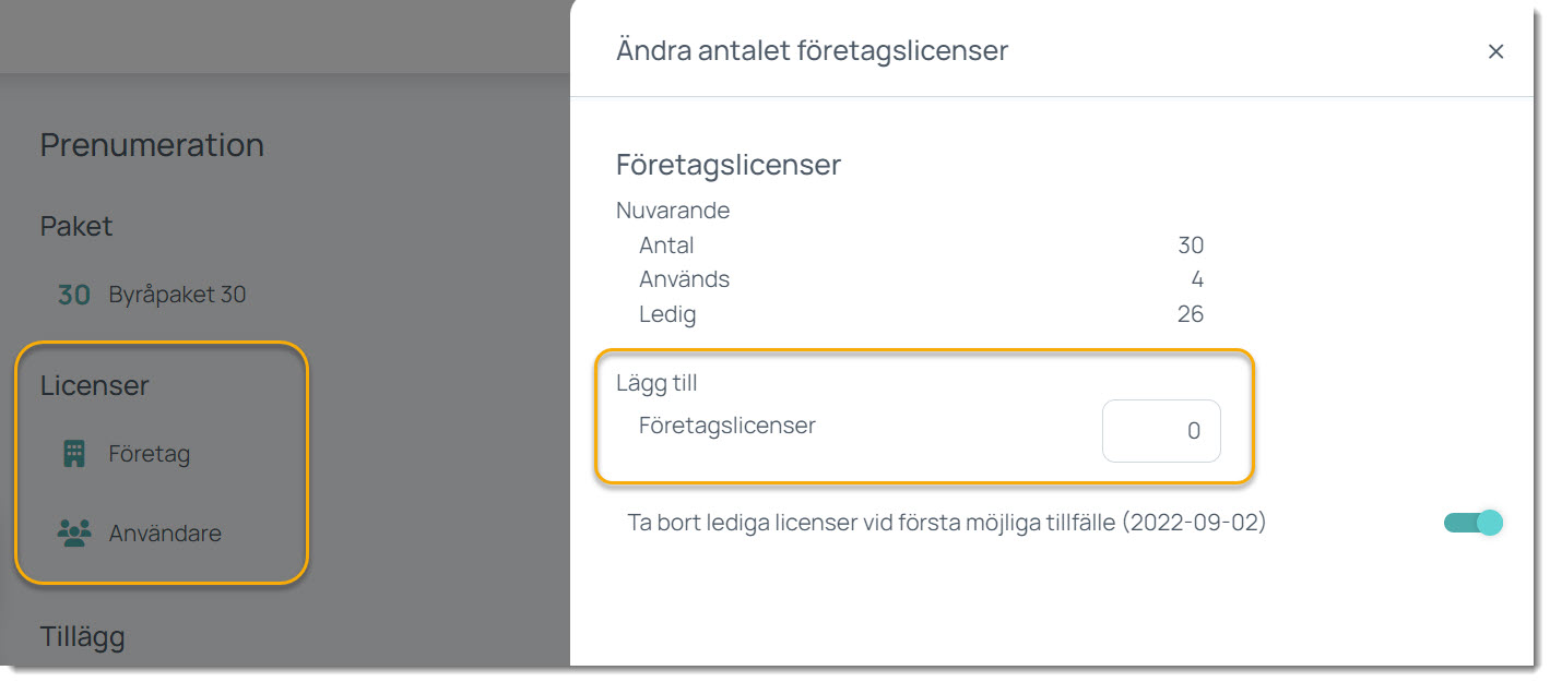- Licensöversikt: Under ”Licenser” ser du hur många företags- respektive användarlicenser du har tillgängliga och kan köpa fler vid behov.