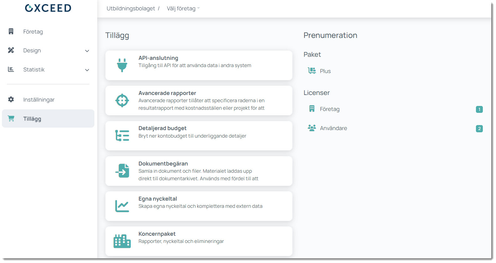 Som prenumerationsadministratör kan du enkelt aktivera, inaktivera och utvärdera tillägg per företag, vilket ger dig flexibilitet att skräddarsy din lösning. Många tillägg kan testas kostnadsfritt i 14 dagar, så du kan utforska deras funktionalitet innan du bestämmer dig.